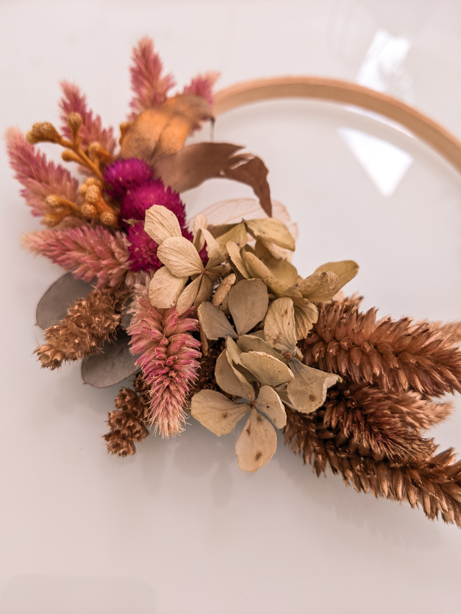 Guirlanda decorada com folhagens secas nas cores verde, vinho e detalhes acobreados. Arrematada com canela em pau e penduricalho em madeira de pinus, personalizável.