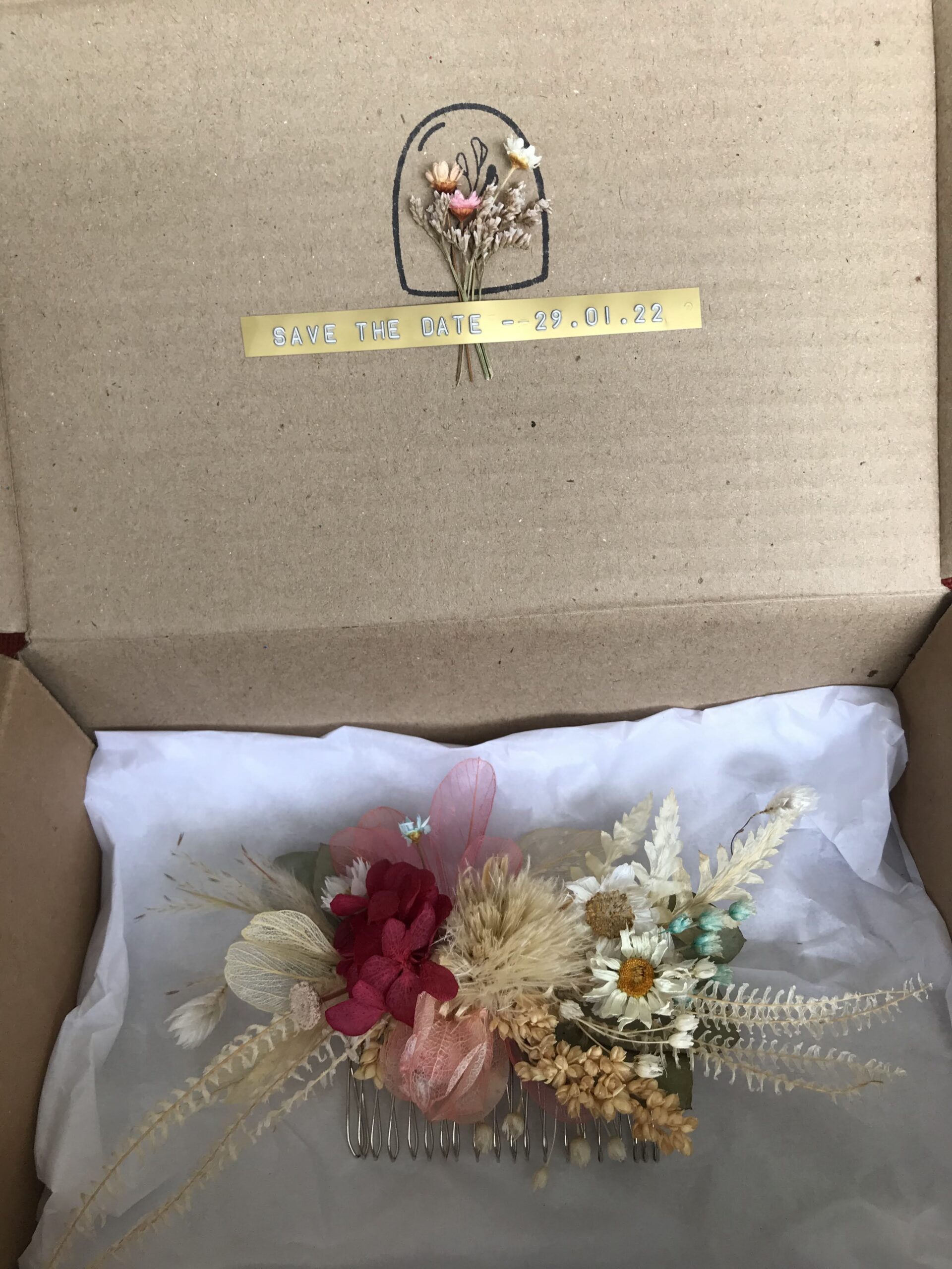Arranjo de cabelo em floral para as noivas que gostam das desidratadas e preservadas. Composição com flores folhagens naturais desidratadas.