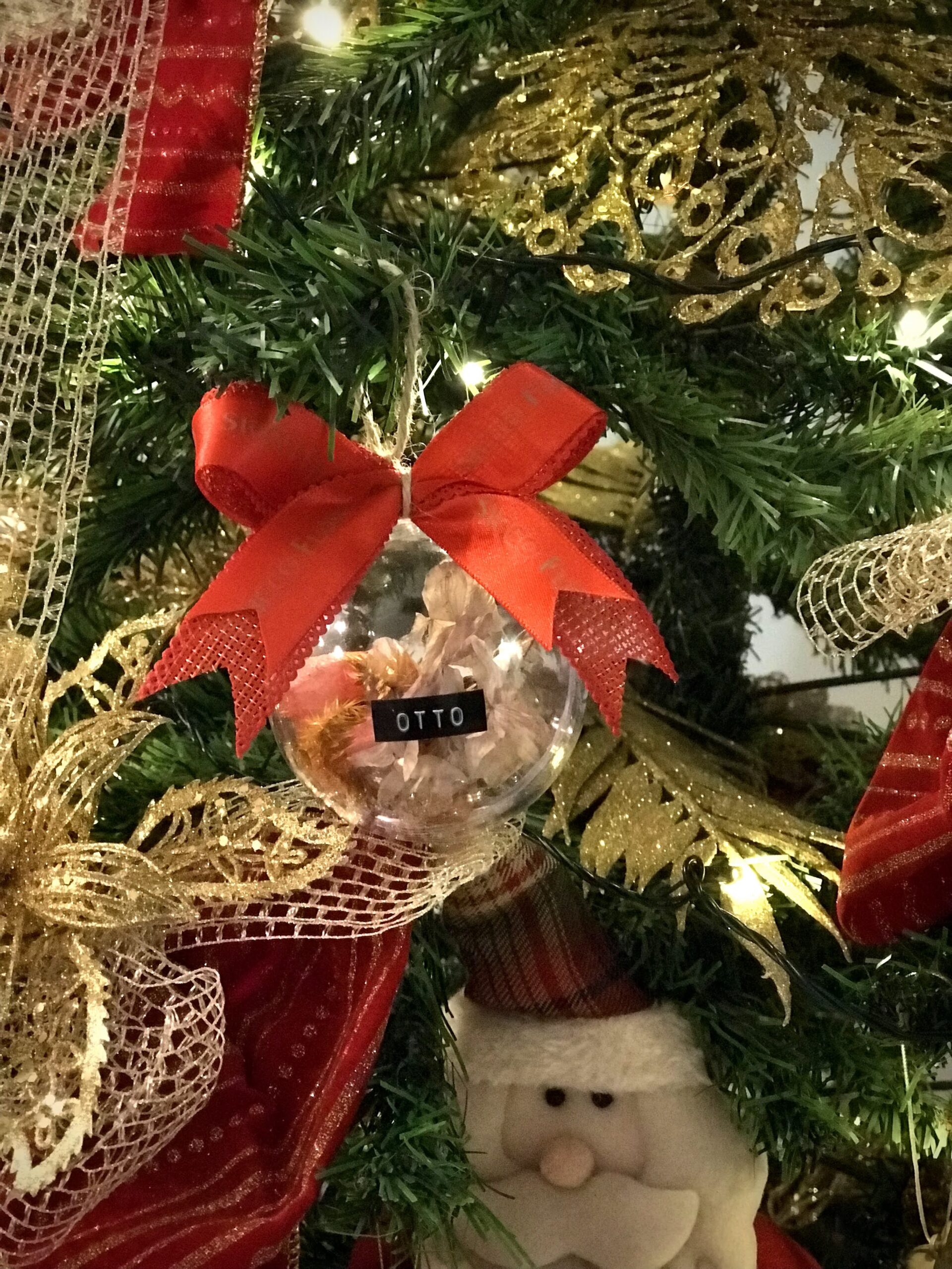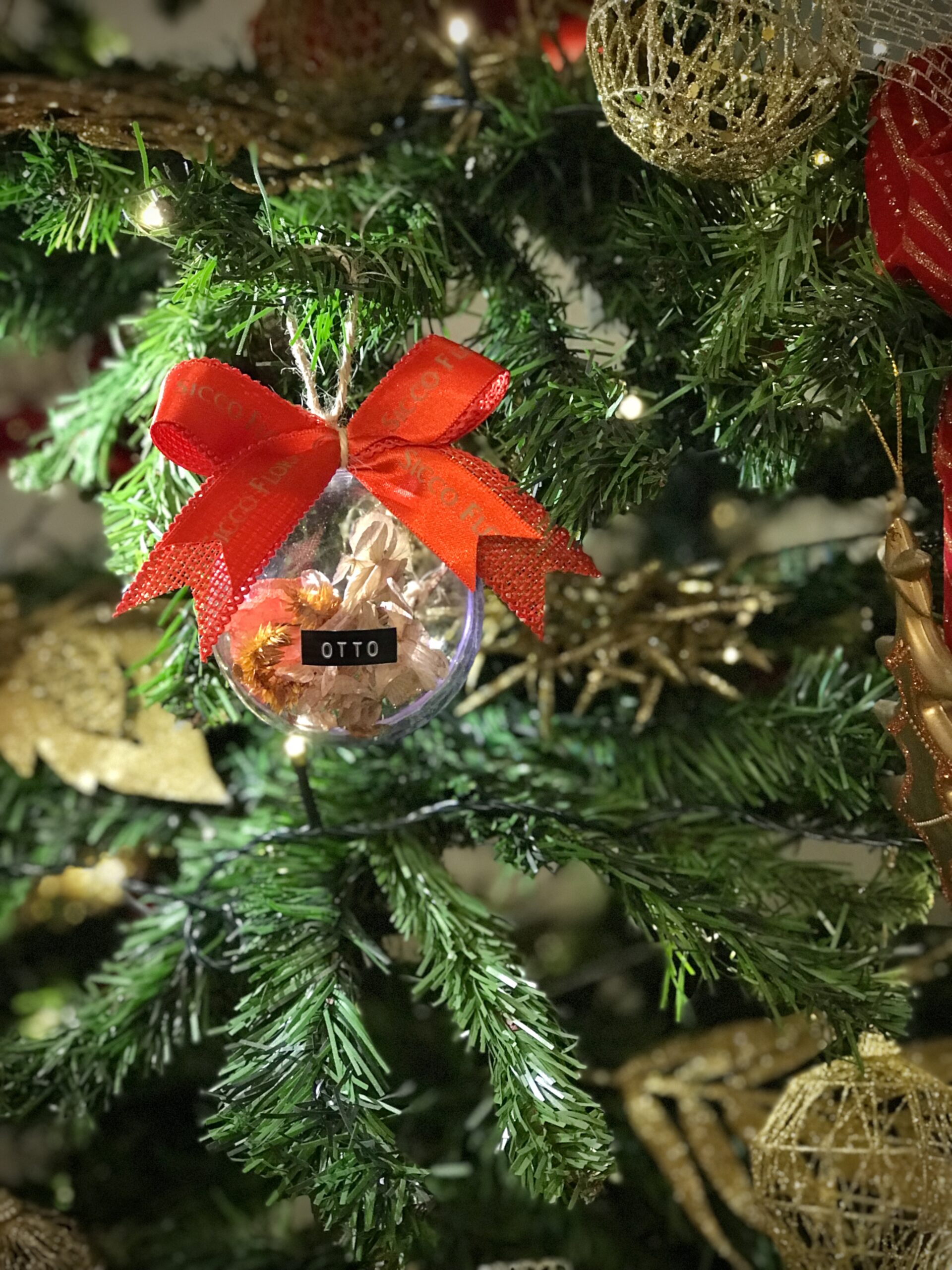 Bola de acrílico com flores e folhagens variadas desidratadas; podendo ser personalizada com o nome de cada membro da família.