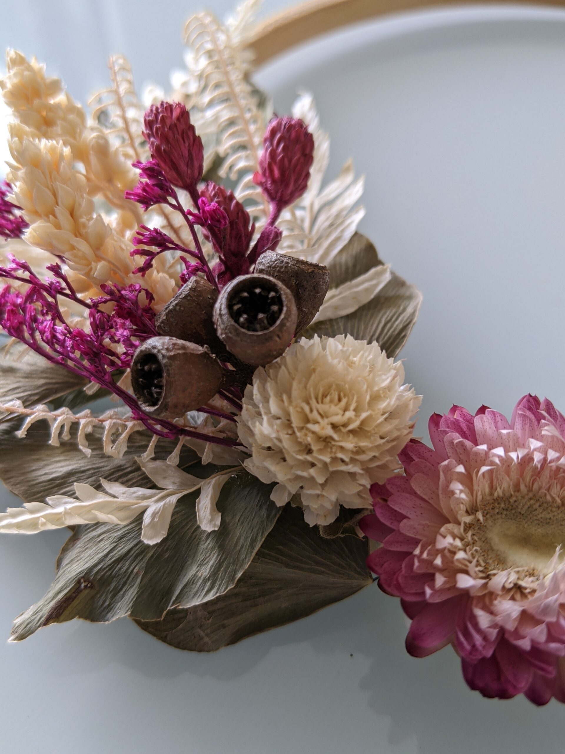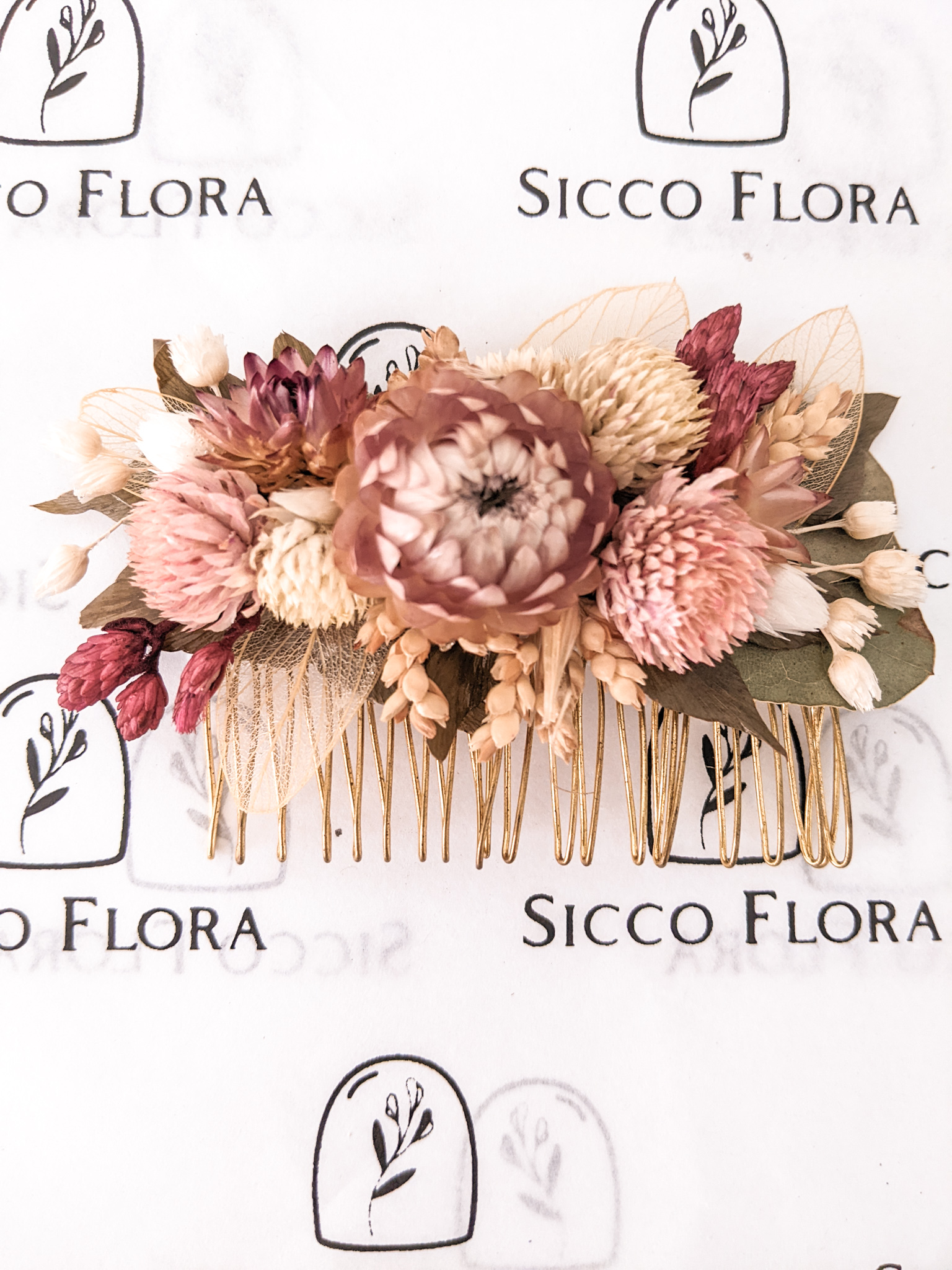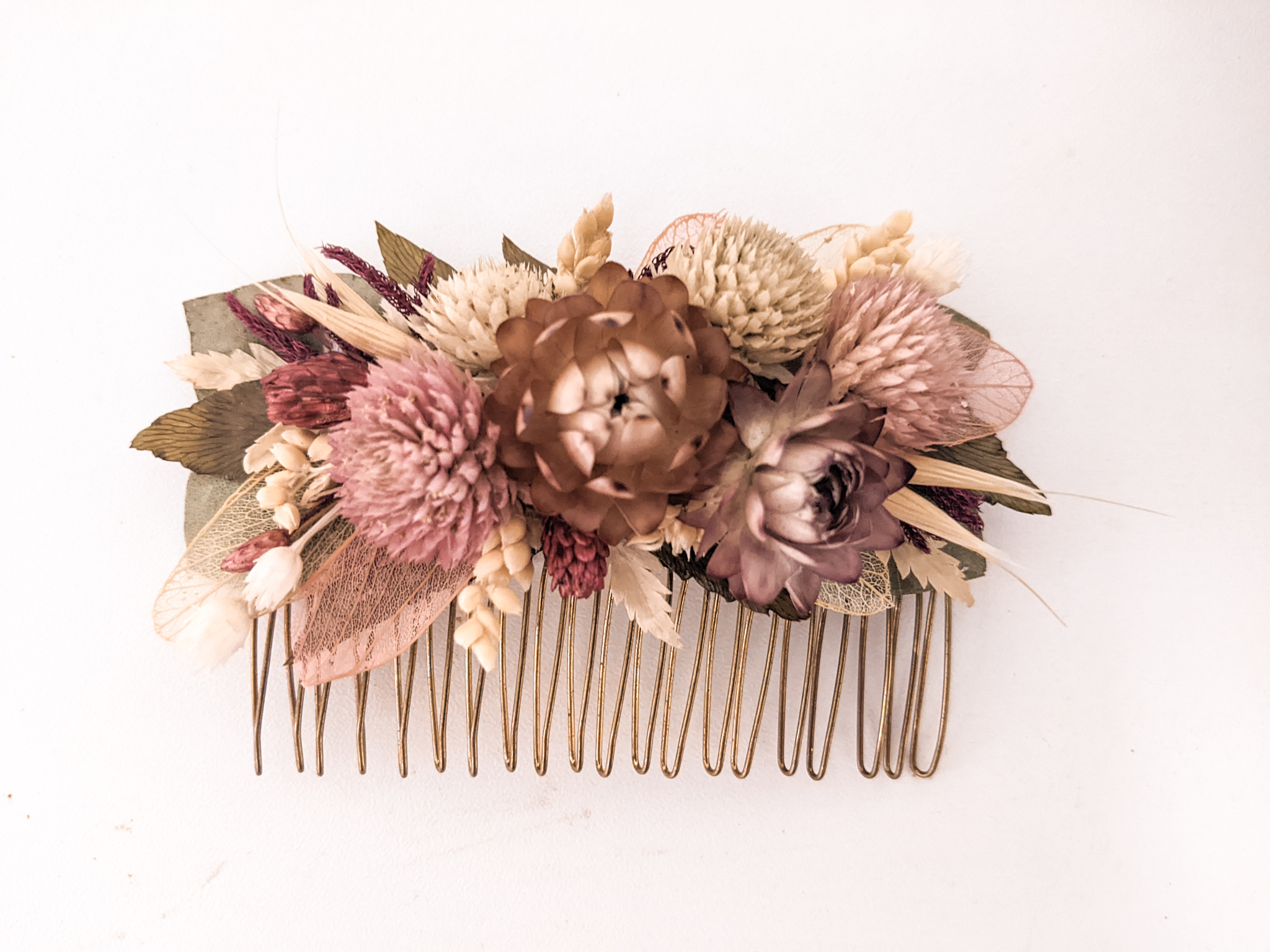 Arranjo de cabelo em floral para as noivas que gostam das desidratadas e preservadas. Composição com flores folhagens naturais desidratadas.
