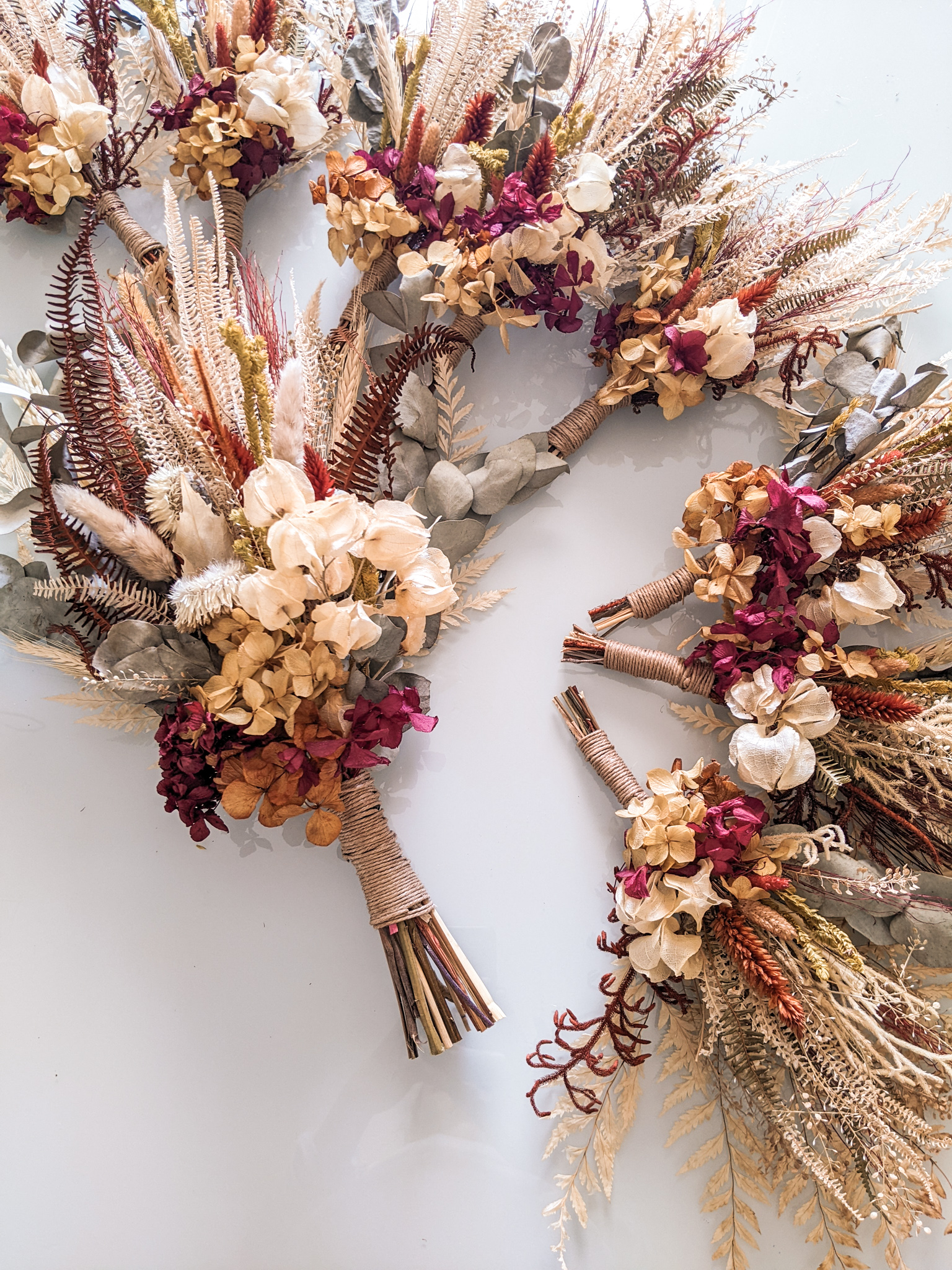Mini grinalda confeccionada com flores e folhagens desidratadas na paleta de cores indicada pela cliente.