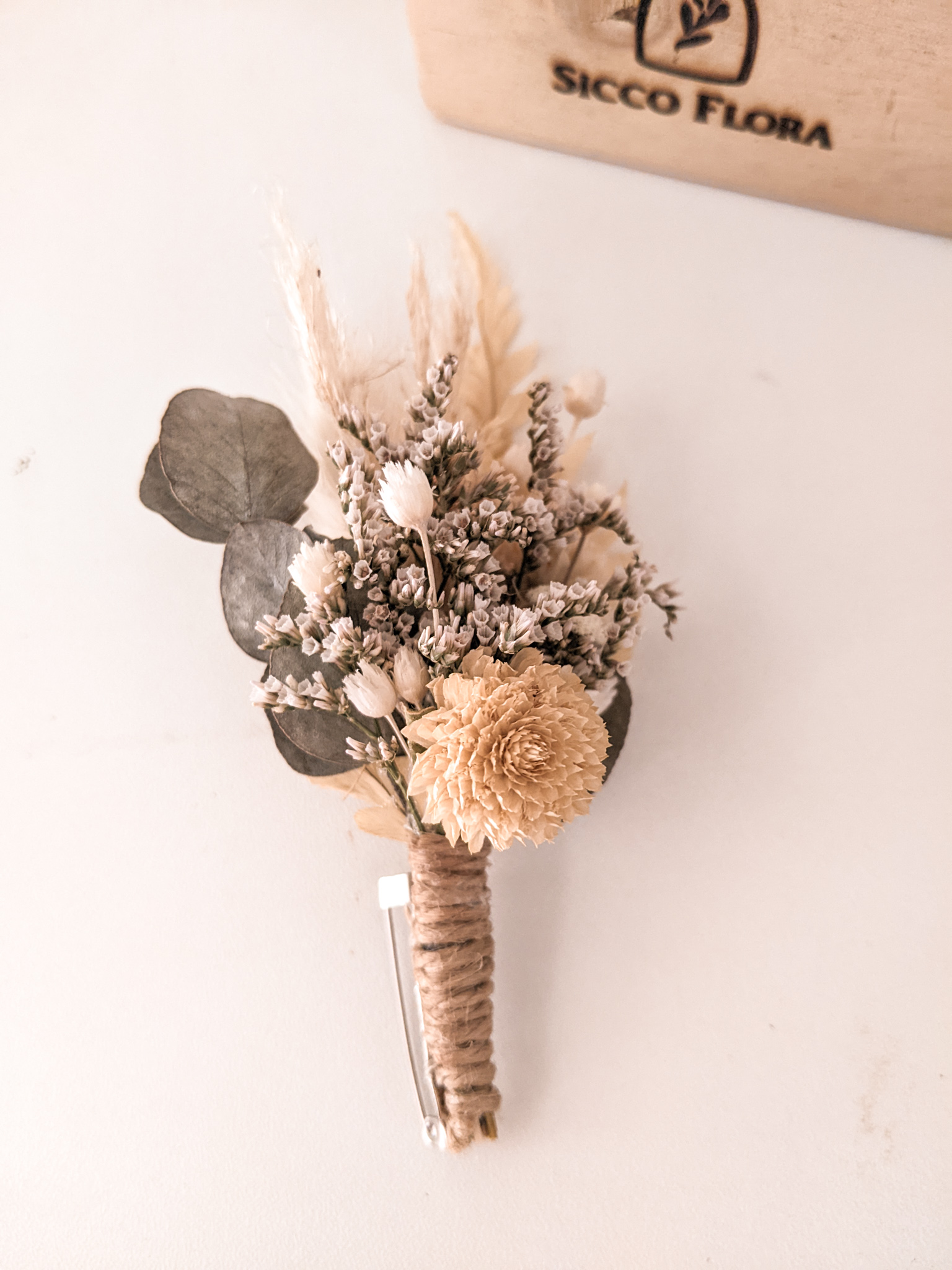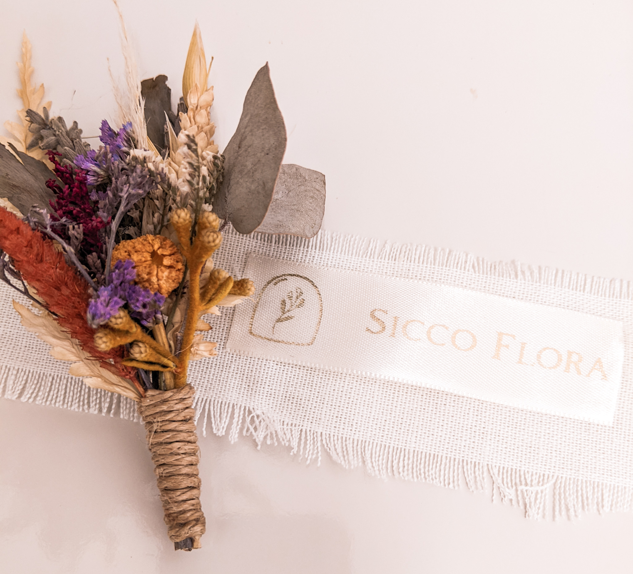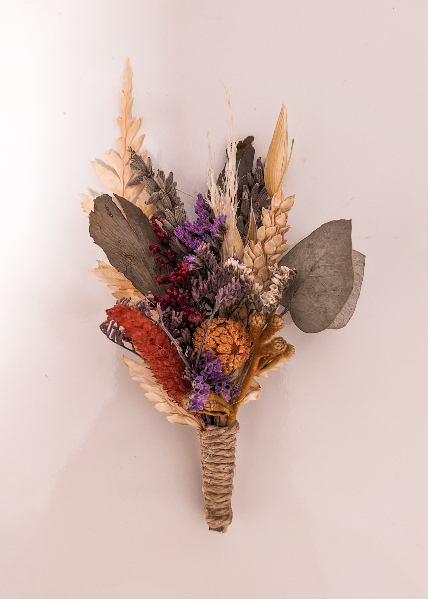 Lapela de flores e folhagens naturais desidratadas. Confeccionada conforme paleta de cores escolhida, totalmente personalizável.