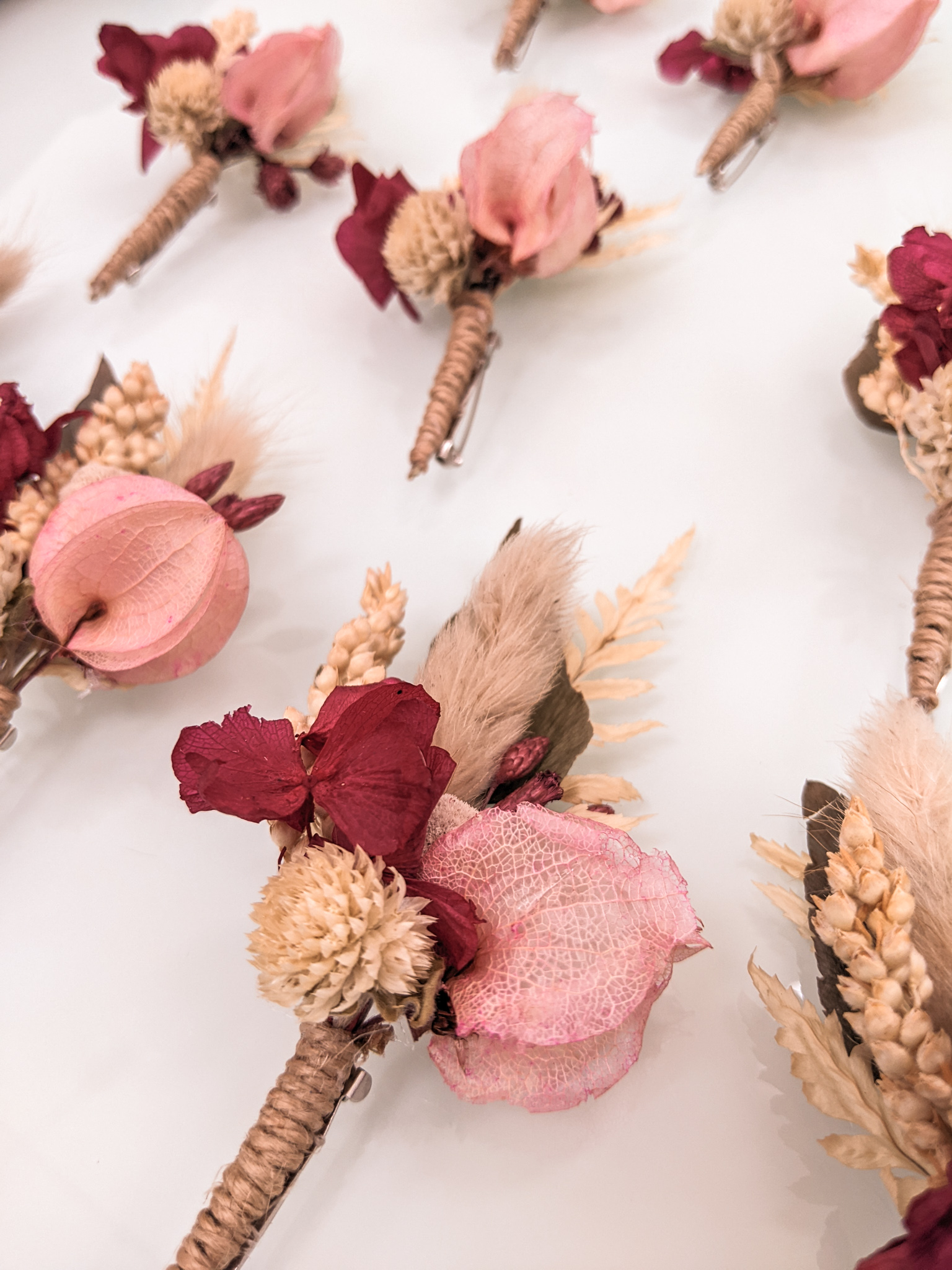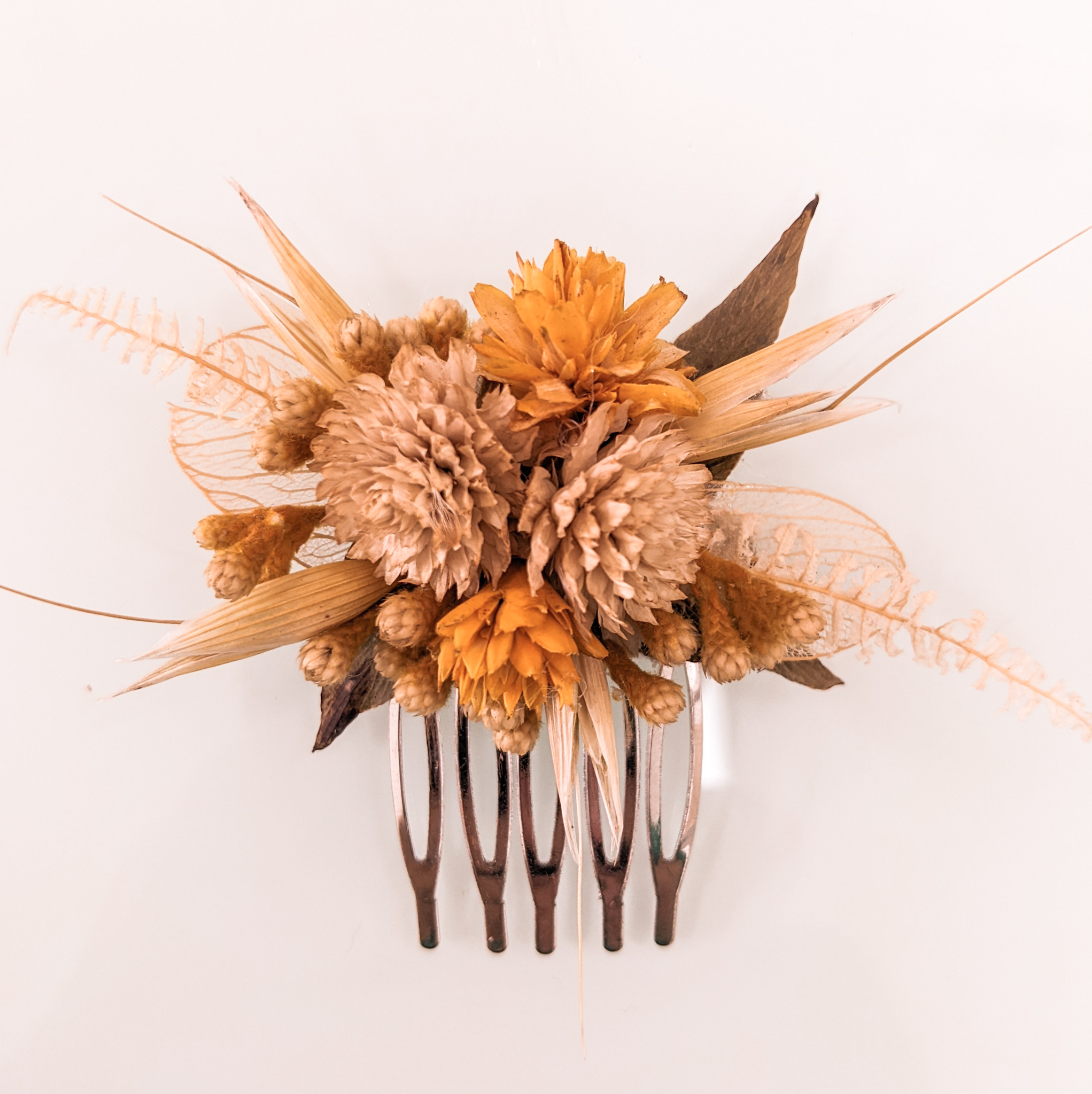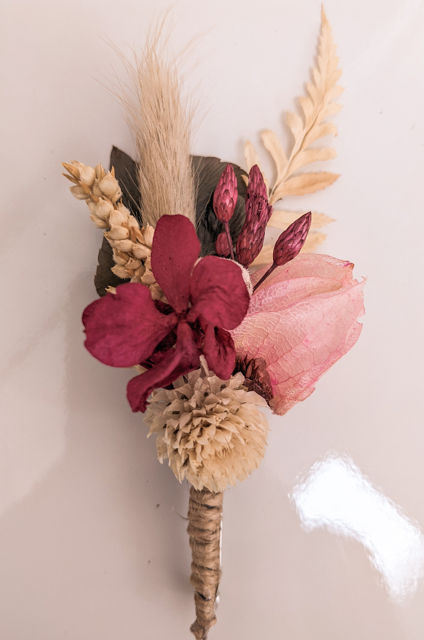 Lapela de flores e folhagens naturais desidratadas. Confeccionada conforme paleta de cores escolhida, totalmente personalizável.