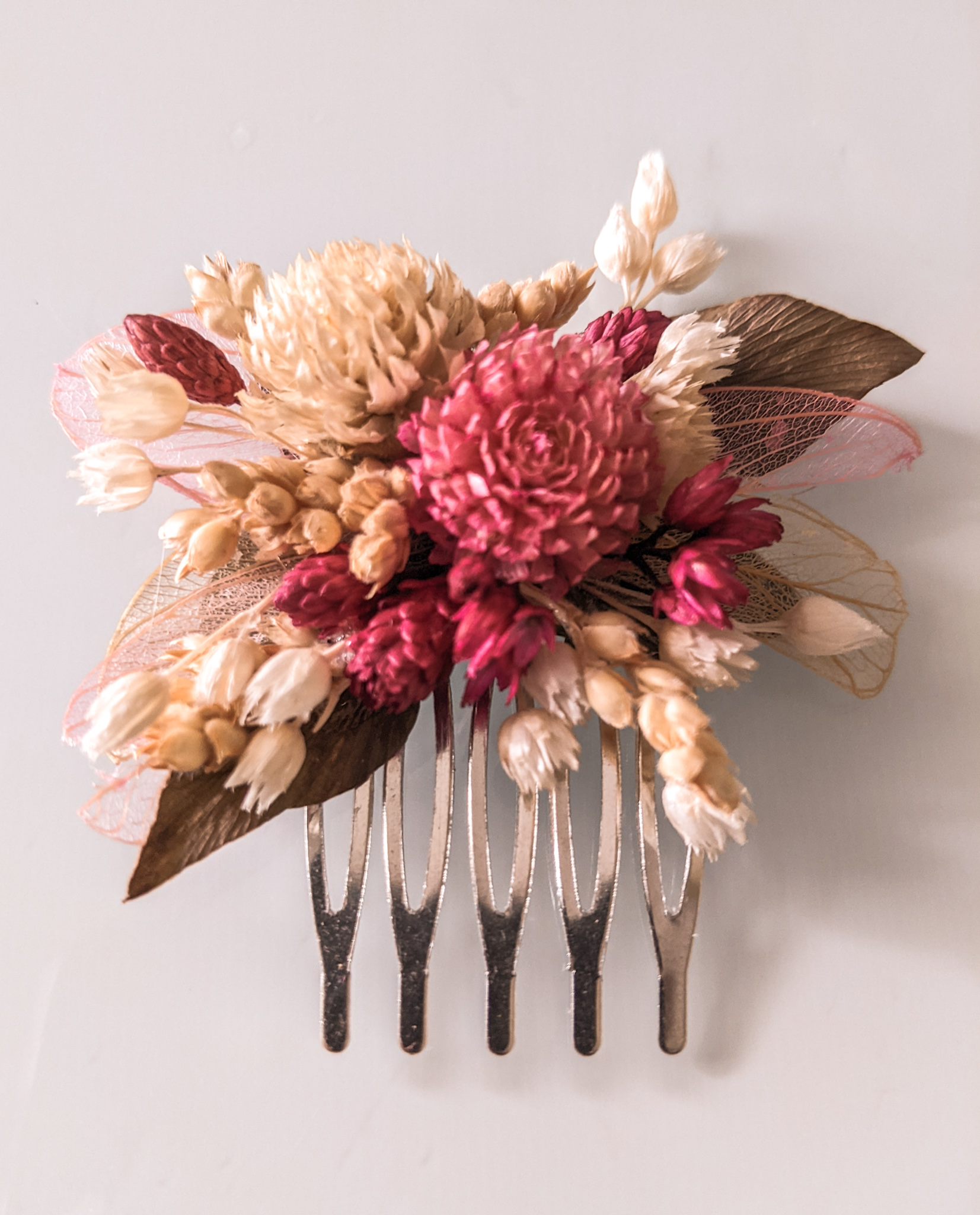 Mini buquê confeccionado com flores e folhagens naturais desidratadas feito sob encomenda.