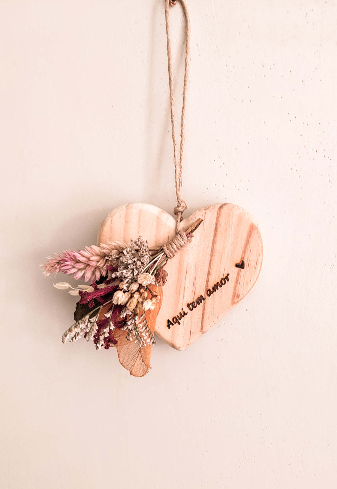Pendente floral confeccionado com flores e folhagens desidratadas e coração de madeira com gravação personalizada.